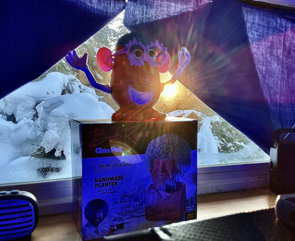 photo: with a December 2025 that dropped somewhere between 80 and 90 inches of snow, ice, wind, and a whole lot of subzero, Capricorn aligned at 23.5°S on this the day when the sun reaches it’s southernmost point, a clearly inspired Bob Ross and a visibly joyous Mr. Potato (wearing the sunglasses) celebrate in anticipation of the slow, annual return to brighter, warmer days.